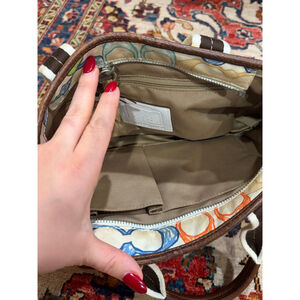 Iconic Coach Hamptons Weekend patchwork tote featuring vibrant multicolor canvas panels in classic Coach prints, stripes, florals, and signature C motifs. Finished with cream webbed straps and brown leather trim. A standout Y2K-era Coach piece that’s both playful and collectible.