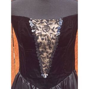 Gunne Sax Strapless Gown, NWT, Size 13, Rayon, Acetate, and Nylon, Made in USA, Sequined/Embroidery/Mesh Detailing, Approximate measurements armpit to hem 35”, chest 17”, waist 15”.