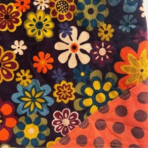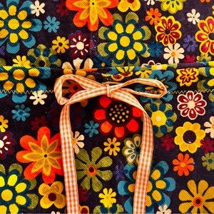 Handmade floral skirt. So fun for spring! Deep eggplant background with multi-colored 70s-inspired floral fabric. Feels like lightweight 100% cotton corduroy. Nicely finished seams inside. Orange drawstring ribbon waist with hidden slip pocket on front inner waistband. 32” waistband that cinches. 20” length. Best for S-M, but consider measurements first.
