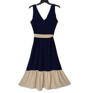 New with Tags, DKNY Women's Sleeveless Colorblock A-Line Midi Dress, Navy and Khaki with belt, Size 6, Retails $134.