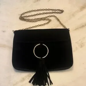 This elegant black velvet shoulder bag features a stylish chain strap and a chic tassel detail. Perfect for any occasion, it adds a touch of sophistication to your outfit. The brand is Street Level and pricing reflects slight tarnish on the chain.