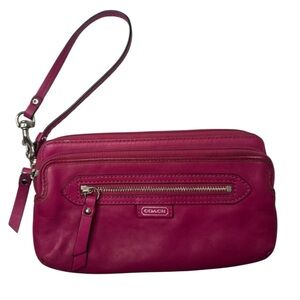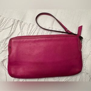 Elegant pink leather wristlet. Features zippered compartments. Stylish and compact design.