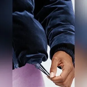 Luxurious velvet jacket. Rich navy color. Perfect for cool weather. Fabletics Navy Wander Velour Cropped Puffer Jacket-Size XL