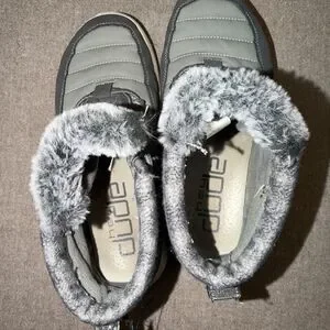 The Hey Dude Women's Brandy Grey Lace Up Light Weight Boots in size 7 are a stylish and comfortable choice for women on the go. These ankle boots feature a round toe, lace-up closure, and a low heel for easy wear. Made with a blended fabric upper and faux fur lining, they are perfect for travel, activewear, or casual outings. The rubber outsole provides durability, while the lightweight design offers comfort and flexibility. With a solid gray color and outdoor theme, these boots by Hey Dude are a versatile addition to any wardrobe.