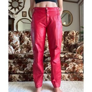 red leather pants, vintage moto style, 80s statement trousers, made in korea leather, j park collection pants, rocker vintage, genuine leather fashion, cherry red vintage, bold vintage look,