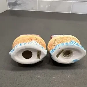 This vintage ceramic salt and pepper shaker set features Noah's Ark animals on a boat, making it a unique and charming addition to any kitchen decor. The set includes both a pepper shaker and a salt shaker, and is crafted from ceramic, giving it a high-quality and durable feel. Its vintage design adds a touch of nostalgia to any dining table, while the animal theme adds a playful and whimsical element to the kitchen. Made in China, this set is sure to be a conversation starter and a cherished collectible for animal lovers and vintage enthusiasts alike. missing one stopper.