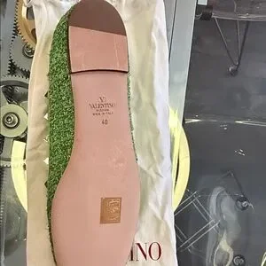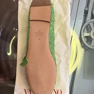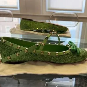Elegant green flats with studded straps. Features a charming bow detail. Perfect for stylish outings.