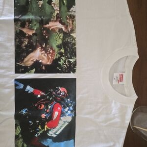 Supreme's Junya Watanabe CdG Man Nature T-shirt features co-branding on its chest as well as two other images.