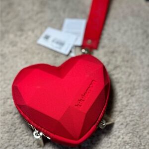 Stylish red heart-shaped wristlet by Lululemon. Features a convenient strap and zipper closure. Sold out