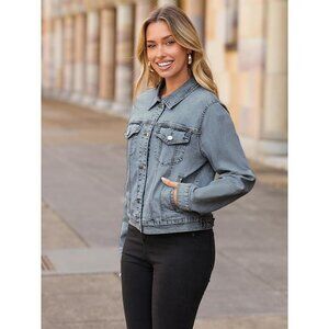 A timeless single-breasted lapel women jean jacket, with two functional flap chest and side pockets keep essentials close yet stylish, perfect for both casual outings and dressed-up moments.