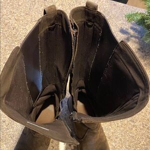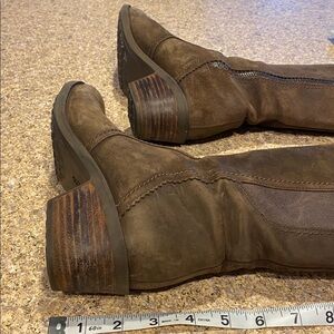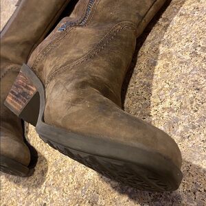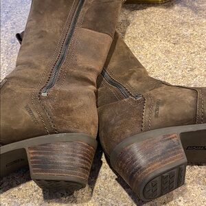 Teva Tall Leather Brown Boots Waterproof Casual Heel Boots Size 7 1103232 I believe the style was called Anaya. I’m unsure if these are considered Suede? I feel they are a suede type leather but I could be wrong. These are in used condition showing all over wear and with imperfections from wear including stains, scuffs, scratches, creases and other imperfections. I purchased these second hand for myself but I really need a half size larger. I am normally a 7.5 and these are a 7. They fit on me well so I thought they fit when I purchased but they hurt my toes after wearing one day so I believe I need my normal size of a 7.5. They are really cute! Any measurements are very rough to give an idea of size. Colors may be off because of lighting. Since they are used and aren’t new there may be other imperfections.
