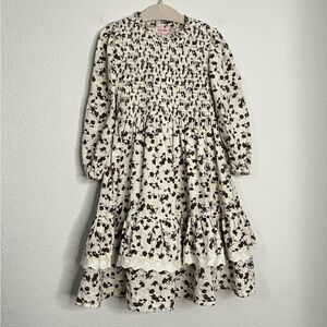 With elasticated smocked body, tier at skirt and with cream trim with punched hole detail and scalloping