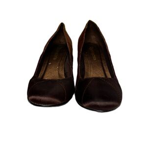 Earth tone Patchwork Pumps Wood Heels Brown Wine Copper Gold Satiny Women’s 8.5