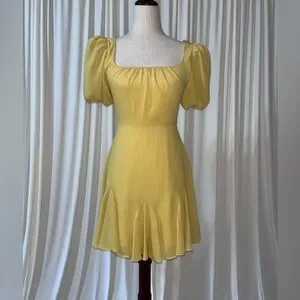 Chic yellow mini dress with puff sleeves by Astr the Label. Flattering fit and playful ruffle hem. Fabric has a nice texture to it. Hidden side zip. Perfect for any occasion.