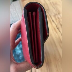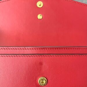 Gucci Silvie wallet featuring bold red and blue design. Accented with a luxurious gold clasp.