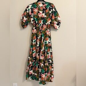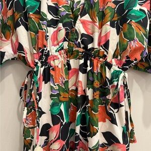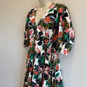 Stunning floral MISA maxi dress features a vibrant mix of colors, it's perfect for any occasion. The dress offers a flattering fit with adjustable waist cinching ties, pockets and side slits. Soft and comfortable 100% cotton dress will fit up to a size medium. Pre-loved in excellent condition.