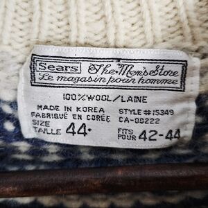 VINTAGE | Sears 100% wool knit crewneck fair isle norwegian design sweater. There is some pilling throughout the garment which can easily be sweater shaved. See photos for details. Otherwise good pre-owned vintage condition.