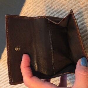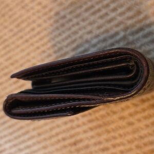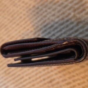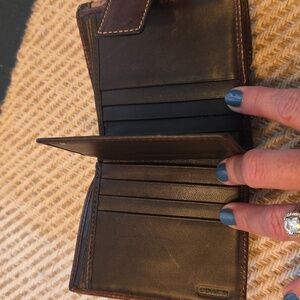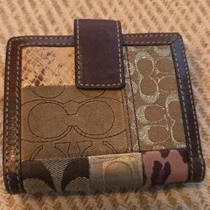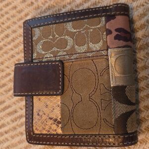 Elegant patchwork design with gold, brown, and tan accents. Features signature Coach logo and unique textures. This has 11 cc slots bumillfold pockets 2 snap change pocket on outside and ID plastic slot. Size is 4 x 4.5 approximately. please see all pictures all sales final.