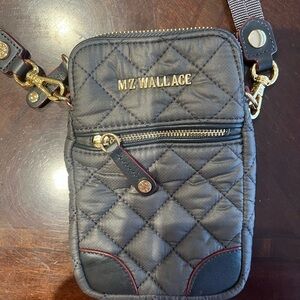 Mz Wallace Compact quilted crossbody with adjustable strap. Features front zip pocket and gold-tone accents.