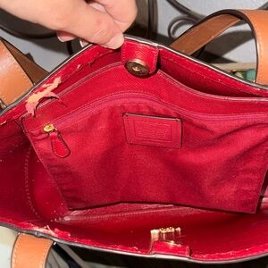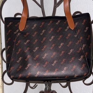 Elegant Coach handbag with signature pattern. Features black and brown tones. Ideal for daily use. Inside small tares see photos