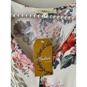 This is a women's NWT cream colored short sleeve v--neck dress with a pattern of multicolor flowers from Andre by Unit, size Large.