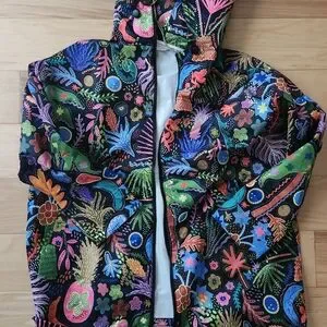 Bold abstract rain jacket with vibrant patterns. Features a zip-up front and hood. Lightwaight and beautiful. australian brand so size number is onw bigger than US sizing.