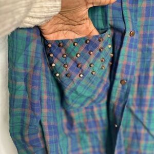 Stylish plaid shirt with a mix of green, blue, and brown. Ideal for everyday wear.