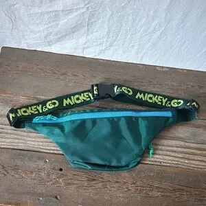 Green bag with Mickey Mouse design. Features zippered pocket and adjustable strap.