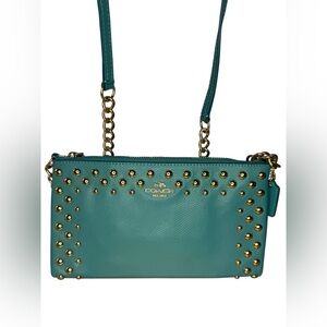 Coach Quinn Crossbody Bag (Style: F53140) in Cadet Blue. It features gold-toned studded hardware on a cross-grain leather exterior.