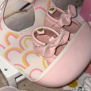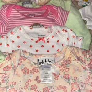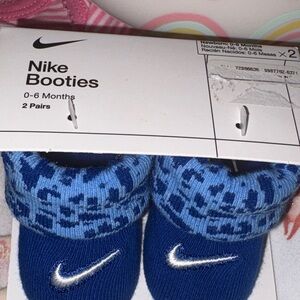 Adorable baby bundle 7 onesie new 2 bibs 2 pair of shoes 1 pair Nike booties baby album bookwith to include extras Includes pink and white shoes, a blue teddy bear, and cream hoodie terry cloth towel all in excellent condition