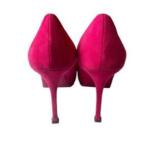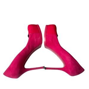 These are authentic YVES SAINT LAURENT Suede Patent Goatskin Tribute Two Platform Pumps 39.5 in Fuchsia. These stunning heels are crafted of suede leather in pink. They feature a 4.5 inch stiletto heel and a pink patent leather cap toe. These are marvelous heels with a distinctive look, from Yves Saint Laurent