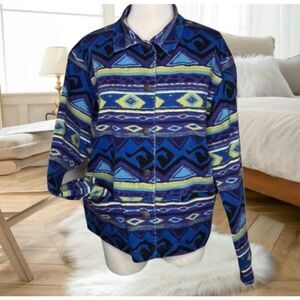 SUPER COOL VINTAGE DENIM JEAN JACKET WITH AZTEC SOUTHWEST PRINT. SUPER SOFT WITH A LITTLE BIT OF STRETCH, BUTTON FRONT WITH POCKETS