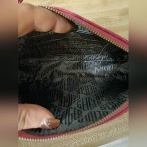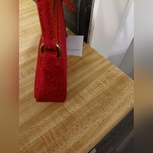Sparkling red clutch with gold accents. Features a wristlet strap. Perfect for evening outings.