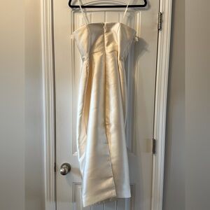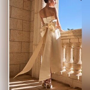 New with tags condition. This elegant cream ivory gown is perfect for special occasions. Detachable bow allows for dress to be warm many ways. Dress is new with tags but was tried on at local boutique. No stains are noted.