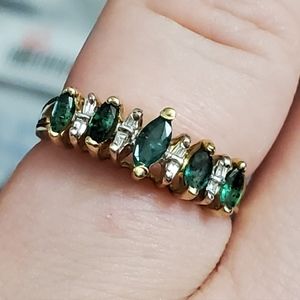 This exquisite ring features stunning green stones set in a luxurious gold band. Perfect for adding a touch of elegance to any outfit.