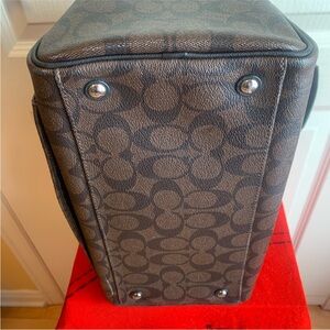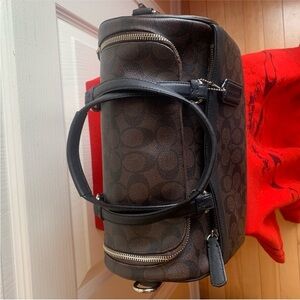 Elegant Coach duffel bag with signature pattern. Rich brown and black tones. Ideal for travel or daily use.