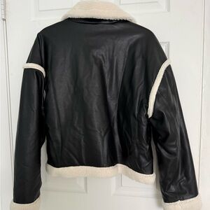 Stylish black faux leather jacket with cozy cream sherpa lining throughout. Features an oversized collar, button front closure, two front slip pockets, and soft sherpa trim detailing along the seams, cuffs, and hem. Warm yet lightweight — perfect for fall and winter layering.