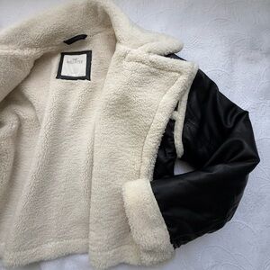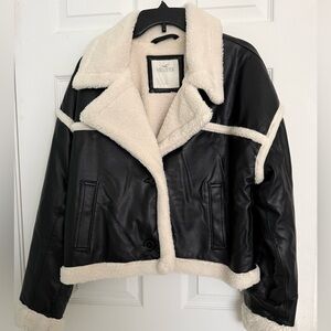 Hollister jacket, faux leather jacket, sherpa jacket, shearling style coat, winter jacket, fall fashion, cozy coat, black leather look jacket, cropped jacket, trendy outerwear, neutral aesthetic, casual chic, streetwear style.