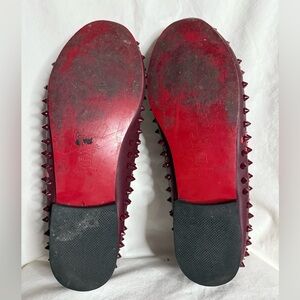 Men’s Christian Louboutin Burgundy Leather Spike Loafers. Burgundy red leather with spike embellishments all over. Slip on loafer style. Color is flaking off, obvious signs of wear, but otherwise good condition. Can take to a cobbler and have them recolored. (Price reflects). Size 44 EU, equivalent to a size 11.