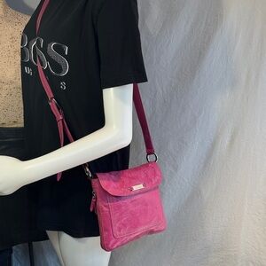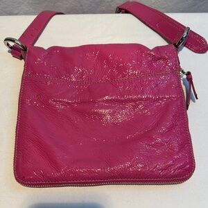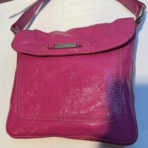 Vibrant fuchsia crossbody with a glossy finish. Features a sleek flap design. Perfect for daily wear.