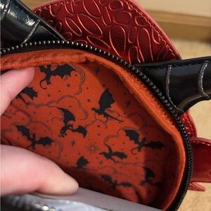 This bold design features a striking red dragon face with detailed textured scales, piercing eyes, and fiery flame accents that make this bag truly stand out. Perfect for fantasy lovers, dragon collectors, and Loungefly fans alike.