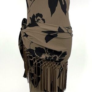 Stylish midi dress with bold floral pattern. Features a sleek silhouette and fringe detail.