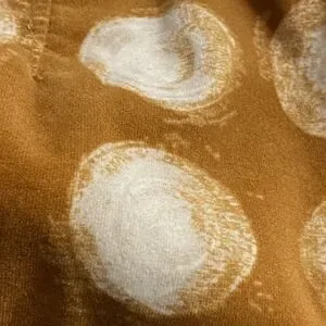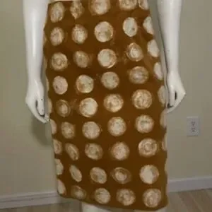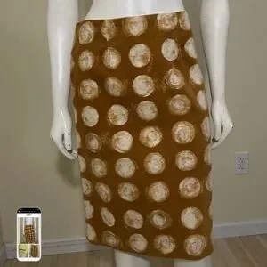 Maeve pencil skirt sold at Anthropologie. Invisible zipper up the back, fully lined, and made from a very fine rib cord fabric that gives it a sort of suede look and texture. Deep mustard yellow gold background with playful antique polka dots.