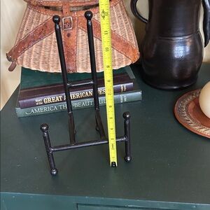 Display your favorite art or books with this elegant black metal easel stand. Its sleek design adds a touch of sophistication to any room.