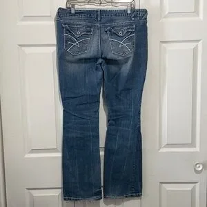 Stylish boot cut jeans by Amethyst Jeans. Features a classic blue wash. Perfect for casual wear. These have a 31” inseam.