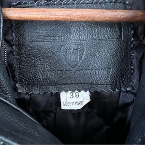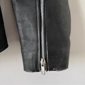 Features: Longsleeve, Full Zip, Moto Style, Biker, Zipper on Sleeve, Quilted Interior Liner Still in Tact, Leather, Harley Davidson Patch on Back, Professionally Dry Clean, Includes Biker Pins