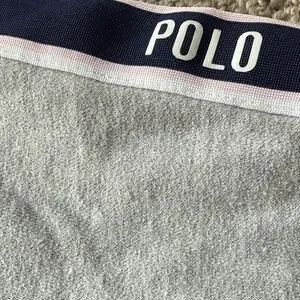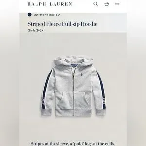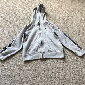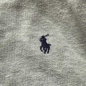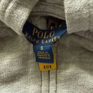 Light gray hoodie with navy stripe details. Features front pockets and zip closure. Iconic Polo logo on chest.