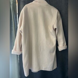 Chic cream Coat with open front. Features rolled sleeves and front pockets. Ideal for layering.
