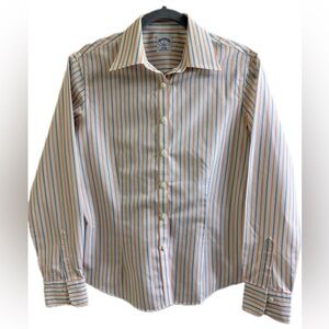 Brooks Brothers #346 Non-iron women's button-down shirt. This classic-fit garment features a cream or white base with multi-colored vertical stripes in shades of orange and blue.