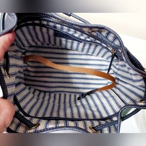 Interior is lined with striped fabric and has 1 zip pocket, 2 open pockets and a clip strap.